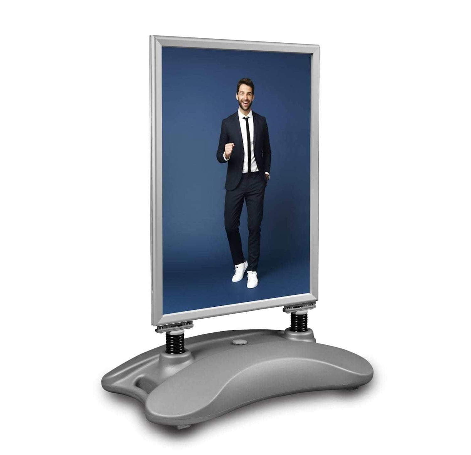Hampton pavement sign – silver ir ļoti populārs āra reklāmas stends, kas īpaši piemērots veikalu, kafejnīcu un restorānu fasādēm. Rāmis ir uzstādīts uz atsperēm, kas ļauj stendam pielāgoties vējam, nodrošinot stabilitāti pat brīzos gaisa apstākļos.