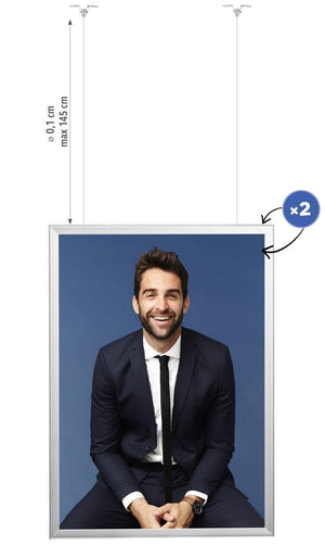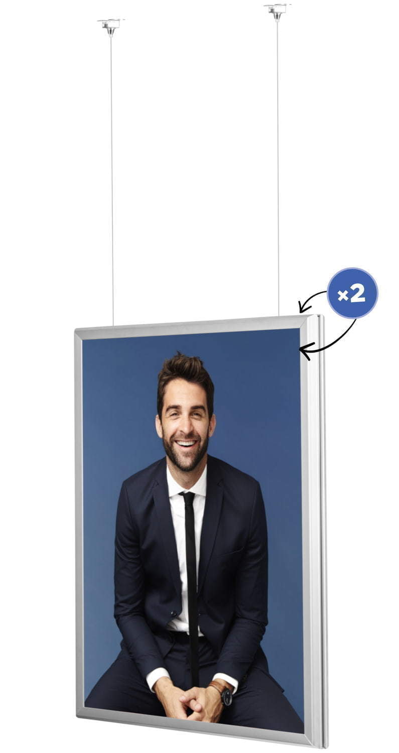 Vertico A2 ir augstas kvalitātes piekaramais rāmis, kas paredzēts divpusējai plakātu un reklāmas materiālu prezentācijai. Ideāli piemērots lielveikaliem, tirdzniecības centriem un publiskām telpām, kur svarīga redzamība no abām pusēm. Clip-clap mehānisms nodrošina īpaši ātru un vienkāršu plakāta nomaiņu, savukārt tērauda troses garantē drošu un stabilu stiprinājumu pie griestiem.
